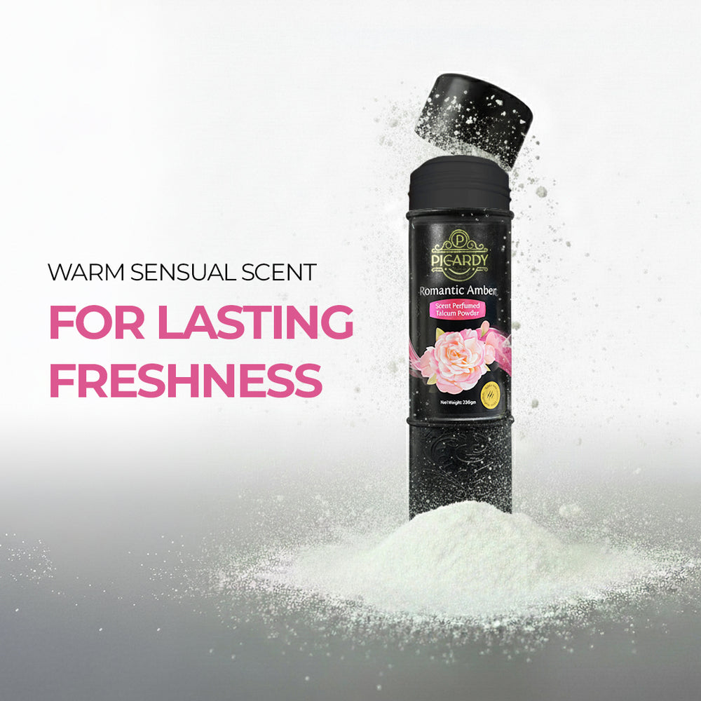 Lasting freshness! Indulge in the sophistication of Picardy Black Romantic Amber Talcum Powder, crafted for a premium experience. Its ultra-fine texture absorbs moisture effortlessly, keeping you fresh and comfortable all day. With a long-lasting floral fragrance and a velvety smooth finish, it's your go-to for timeless elegance and all-day confidence.