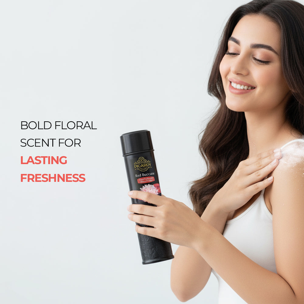 Lasting freshness! Indulge in the sophistication of Picardy Black Red Buccate Talcum Powder, crafted for a premium experience. Its ultra-fine texture absorbs moisture effortlessly, keeping you fresh and comfortable all day. With a long-lasting floral fragrance and a velvety smooth finish, it's your go-to for timeless elegance and all-day confidence.
