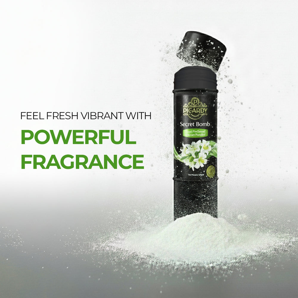 Lasting freshness! Indulge in the sophistication of Picardy Black Secret Bomb Talcum Powder, crafted for a premium experience. Its ultra-fine texture absorbs moisture effortlessly, keeping you fresh and comfortable all day. With a long-lasting floral fragrance and a velvety smooth finish, it's your go-to for timeless elegance and all-day confidence.