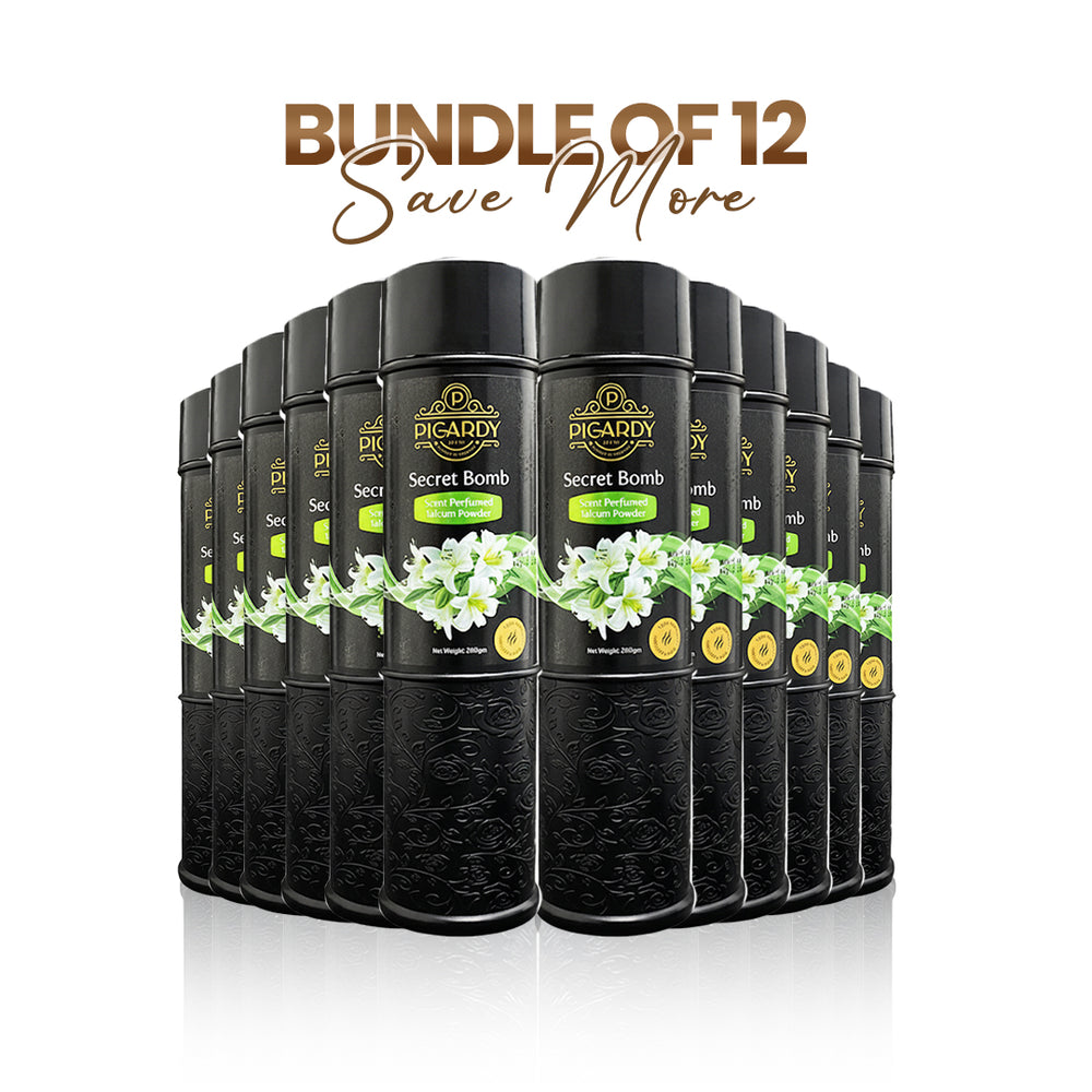Stay fresh and confident with Picardy Black Secret Bomb Talcum Powder – now in a pack of 12. Its ultra-fine formula absorbs moisture to keep your skin dry, smooth, and comfortable all day. Enjoy a velvety finish and a long-lasting floral fragrance for a touch of elegance in every use.
