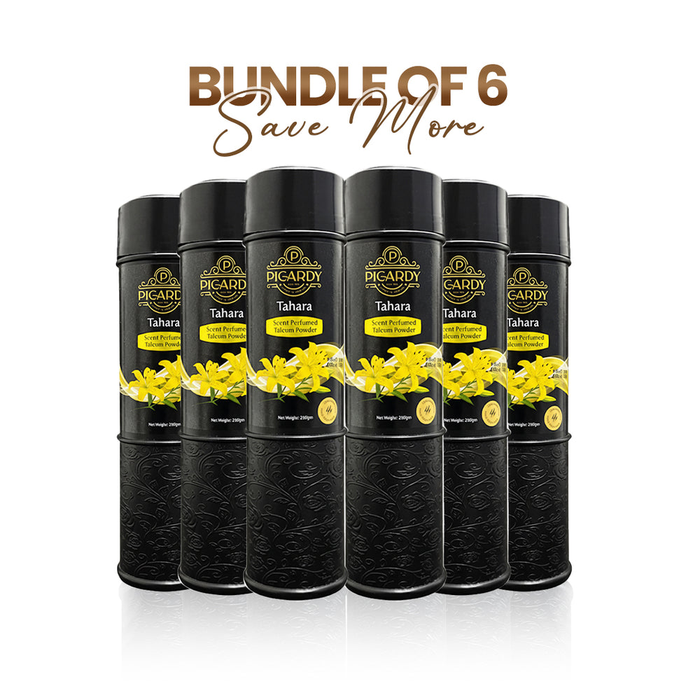 Experience all-day freshness with Picardy Black Tahara Talcum Powder – now in a pack of 6. Its ultra-fine texture absorbs moisture effectively, keeping your skin dry, smooth, and comfortable. Infused with a long-lasting floral fragrance, it offers a touch of elegance and confidence that lasts all day.