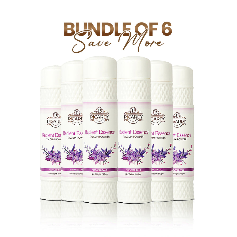 Stay fresh and dry with Picardy Radiant Essence Talcum Powder – now in a pack of 6. This premium formula absorbs moisture and controls perspiration, keeping your skin soft, smooth, and comfortable all day. Suitable for all skin types, it leaves a clean, refined feel with a delightful floral fragrance that lasts.