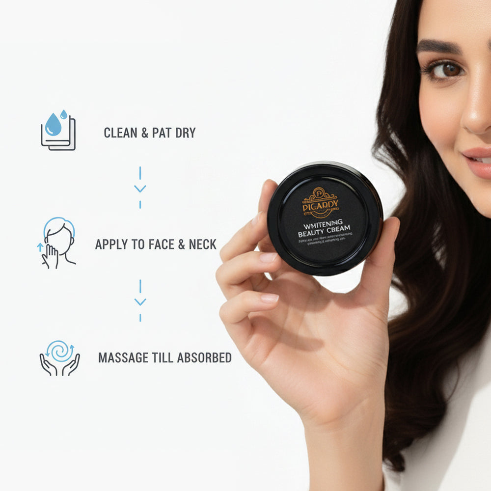 Brighten your beauty! This cream is designed to enhance your natural glow by fading dark spots, evening out skin tone, and deeply nourishing your skin. Enriched with potent whitening and skin-loving ingredients, this lightweight cream works to restore your skin's radiant complexion while keeping it smooth and hydrated. With daily use, you'll notice brighter, clearer, and more youthful-looking skin. It's your go-to for achieving a luminous, even-toned glow.